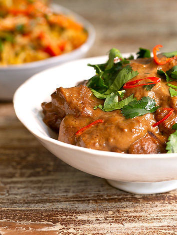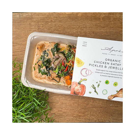 Tender organic free-range marinated chicken with our peanut satay sauce, home pickles & jewelled basmati rice.