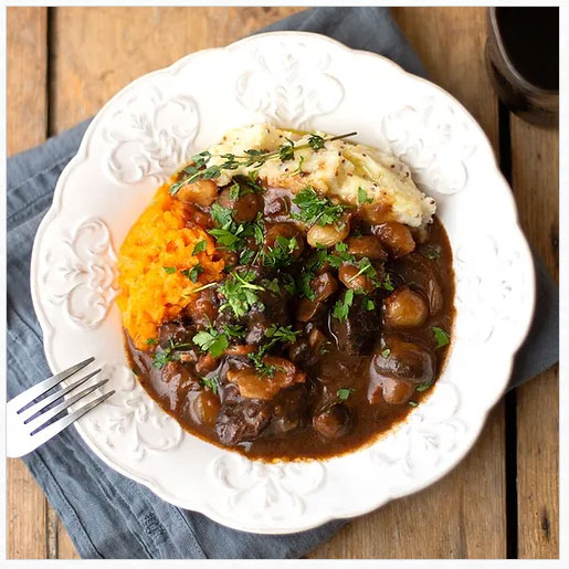 Tender beef, chestnut mushroom, caramelised onion & free-range smoked bacon lardons in our rich red wine sauce with plenty of creamy mashed potato & carrot & swede mash. 490g Serves 1.