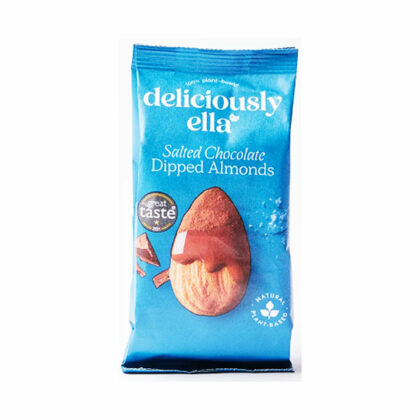 These crunchy roasted almonds are gently salted then lightly dipped in dark chocolate to create a delicious high-fibre snack. 27g.