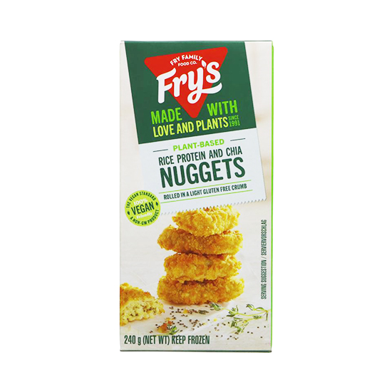 Fry’s Meat Free Chicken-Style Nuggets. Made with selected proteins which come from grains and legumes, these nuggets are coated in a crispy golden crumb to create a flavoursome snack. 380g.