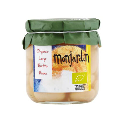 Monjardin Large Butter Beans Organic.  These butter beans, or judiones, are carefully cooked to retain their shape and texture.  The beans are soft, buttery and creamy and can be turned into a smooth puree, used in salads or added late to a slow cooked meat dish.  Drained weight 205g.