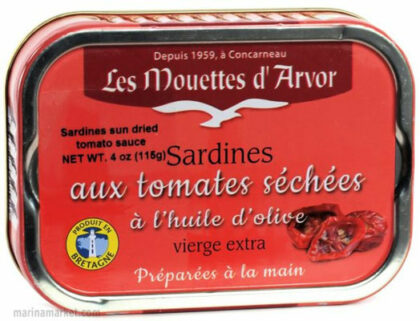 Les Mouettes d’Arvor Sardines rich in Omega-3, naturally preserved in extra virgin olive oil with sundried tomatoes! These sardines have been selected for their quality. They have not been steamed but cooked the traditional way in oil, to give them an incredible flavour and a flesh which is firm and not spongy.