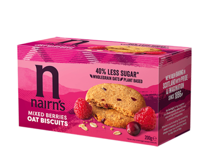 Wholegrain Oats (66%), Demerara Sugar, Palm Fruit Oil, Dietary Fibre, Partially Inverted Syrup, Dried Cranberries (3%), Potato Starch, Barley Malt Syrup, Raspberry Puree Pieces (1%) (Raspberry, Apple Juice Concentrate, Raspberry Juice Concentrate, Pectin, Apple Powder), Raising Agents: Ammonium Bicarbonate and Sodium Bicarbonate, Salt, Natural Flavouring. Allergens highlighted in Bold.